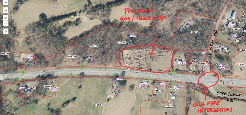 Traffic in this area presents significant safety concerns due to vehicles entering and exiting Silk Hope Road, Stagecoach Road, Harris Grove Church, nearby farms, and private driveways onto the heavily trafficked Highway 64. During peak travel periods, westbound traffic often backs up beyond Chatham Memorial Cemetery. Depending on the location of these access points, both westbound and eastbound lanes are routinely obstructed for entry and exit along Highway 64. Given these circumstances, it is challenging to ascertain how a travel center could operate safely under current or even normal traffic conditions without exacerbating potential hazards.